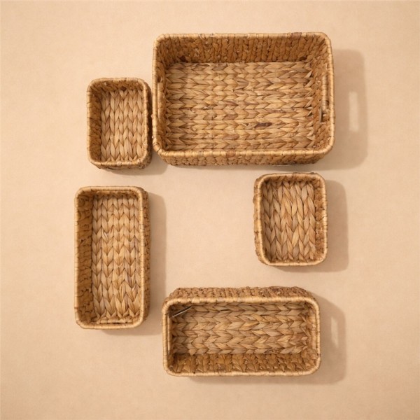 Doğal dokusu ve çok yönlü kullanımıyla 5’li hasır sepet seti, evinizde hem düzen hem de dekoratif bir görünüm sunar. Farklı boyutlardan oluşan set, dolap içi, çekmece, raf ve masa üstü düzenlemesi için idealdir.